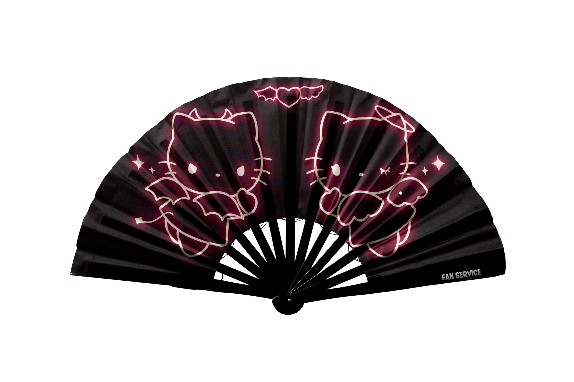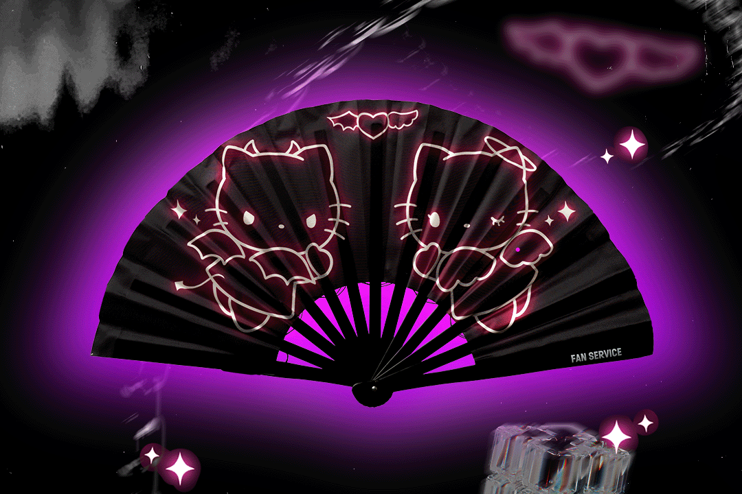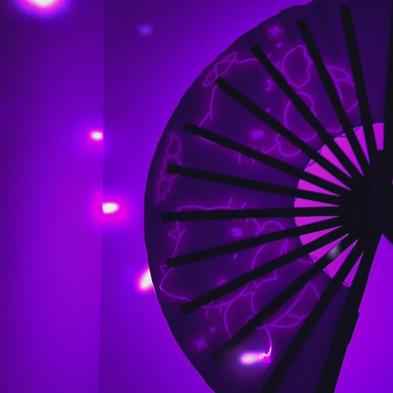 Summon your inner angel and demon with the Neon Baddies rave fan — where kawaii meets chaos in electrifying style. This LED-powered hand-drawn fan features dual neon outlines of an angelic kitty and her devilish twin, glowing in bold magenta against a black backdrop like a cosmic battle between good vibes and dark energy. Inspired by anime aesthetics, kitty mischief, and techno baddie couture, this fan is your go-to accessory for club nights, festivals, and late-night dance rituals.